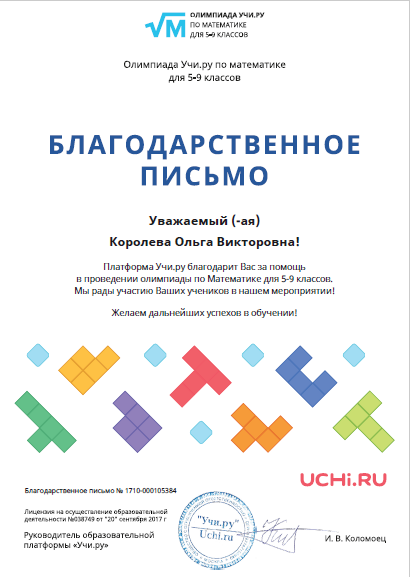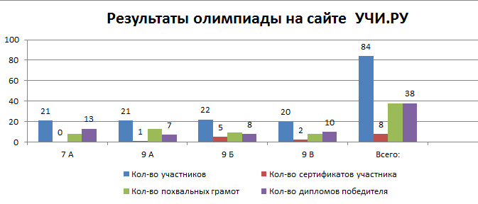В этом году портал УЧИ.РУ впервые провел олимпиаду по математике для учащихся 5 - 9 классов. Интересные интерактивные задания были рассчитаны на 60 минут. В этой олимпиаде приняли участие ученики моих классов: 7 А, 9 А, 9 Б, 9 В. Всего в олимпиаде участвовало 95 человек. Результаты ребят порадовали. Задания олимпиады были доступны ученикам с разной степенью подготовленности. Целью олимпиады стало развитие интереса ребят к математике и решению заданий разной степени сложности. Задания представлены в виде флеш анимации. Это современно и интересно по сюжету задания. Спасибо организаторам олимпиады и разработчикам сайта.